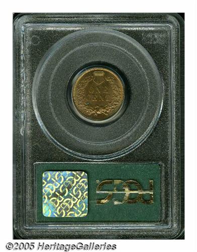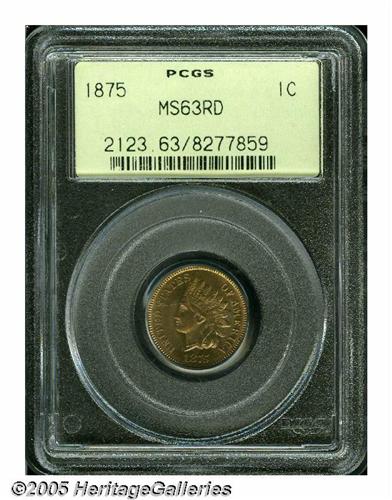 <B>1875<1C> MS63 Red PCGS.</B></I> This brick-red older holder better date Cent is lustrous and meticulously struck. It would surely merit a finer grade, were it not for a single moderate-sized spot on each side.