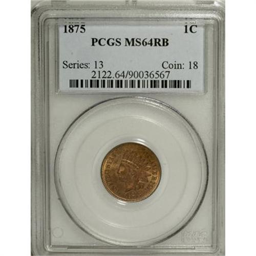 <B>1875 1C MS64 Red and Brown PCGS.</B></I> PCGS Population (179/64). NGC Census: (149/127). Mintage: 13,528,000. Numismedia Wsl. Price for NGC/PCGS coin in MS64: $320. (#2122)<BR><BR><b>Shipping:</b> Coins & Currency (<a target="_blank" href="http://www.heritageauctions.com/common/shipping.php">view shipping information</a>)