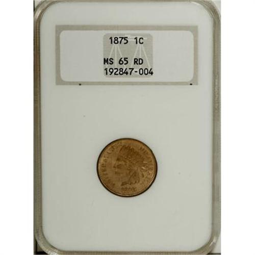 <B>1875 1C MS65 Red NGC.</B></I> The lovely copper-peach surfaces of this delightful Gem are unturned and carefully preserved. Well struck with minimal carbon and a single mark above the headdress that precludes an even finer grade. Census: 8 in 65 Red, 4 finer (7/07).<B><BR></B></I><I>From The Santa Fe Collection.</B></I><BR><BR><B>Coin Engraver:</B> James B. Longacre<BR><BR><b>Shipping:</b> Coins & Currency (<a target="_blank" href="http://www.heritageauctions.com/common/shipping.php">view shipping information</a>\)