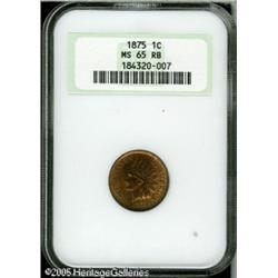 <B>1875 1C MS65 Red and Brown NGC.</B></I> The honey-gold color has mellowed only slightly on the portrait and the left obverse field. A crisply struck and lustrous Gem with formidable eye appeal. Lot:5223
