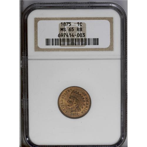 <B>1875<1C> MS65 Red and Brown NGC.</B></I> The reddish-orange surfaces have mellowed in parts; this is more noticeable on the reverse than on the obverse. Solidly struck with only a few small marks, none in the prime focal areas.<BR><I>From The Tigard Oregon Small Cent Collection.</B></I>