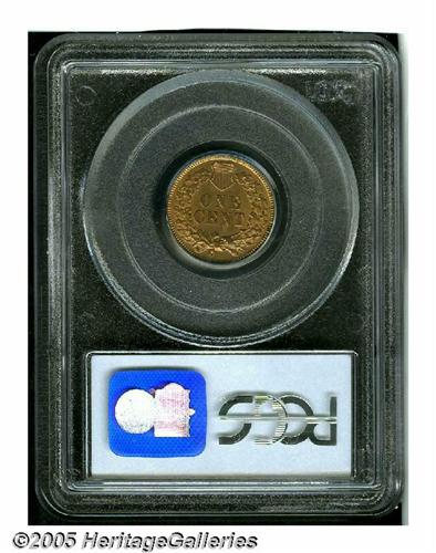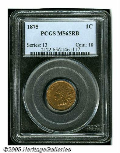 <B>1875<1C> MS65 Red and Brown PCGS.</B></I> Bold N in ONE. Attractive golden-tan luster shines through tan-brown patina. There are hints of lilac iridescence over the central obverse, the striking detail is bold throughout. A frosty textured Gem with blemish-free features.