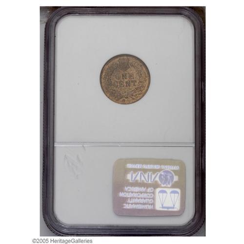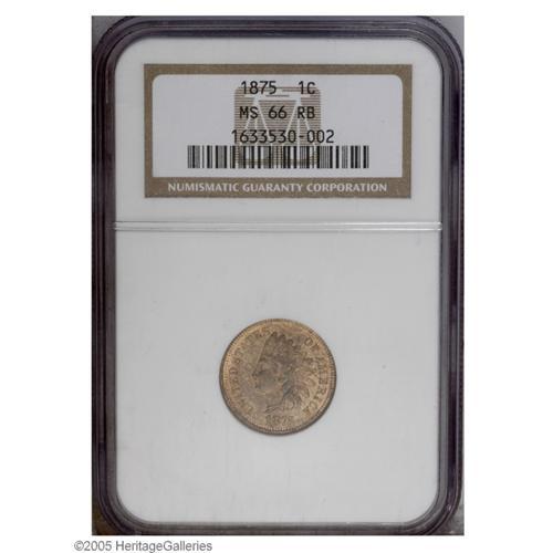 <B>1875<1C> MS66 Red and Brown NGC.</B></I> Well struck and lustrous, with lovely mottled patina overlaying each side, and no apparent abrasions. There are a pair of short, wispy die cracks (as struck) near the lower reverse rim. No example of this issue has been graded higher by NGC. Population: 18 in 66, 0 finer (9/05).