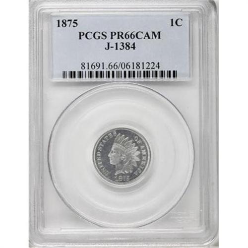 <B>1875 1C One Cent, Judd-1384, Pollock-1528, R.8, PR66 Cameo PCGS.</B></I> Snow PT1a. Regular die trials issue of the proof 1875 cent. Struck in aluminum with a plain edge. The obvious explanation for this piece is it was deliberately struck for collectors. The Judd reference tends to support that contention:<BR><BR> "The year 1875 hosts a potpourri of pattern issues, some with true pattern intent (certain of the twenty-cent pieces may be in this category) and others created as numismatic delicacies, the latter including illogical varieties and mulings. No doubt, Mint Director Henry R. Linderman was among the recipients of these delicacies. All of the illogical combinations as well as off-metal strikings from regular Proof dies were made in secrecy, and the existence of most was not known until years later."<BR><BR> The other way to view this piece is the way Rick Snow presents it, as part of a full denomination set. As such, this would be a metallurgical trial. Only one or two aluminum sets were struck and apparently neither set is intact today. Combining the ninth edition of the Judd book with Snow's reference on 1870-1889 Indian cents yields only three references to known sales. A piece was sold by New England Rare Coin Galleries in March 1983, another was auctioned as part of the Loye L. Lauder Collection by Doyle Galleries in December 1983, lot 536, and there is another transaction by Numismatics Ltd. (possibly also in December 1983). The impossibility of finding photographs of these transactions is obvious. They could be the same coin sold three times in a short time span, two coins and one reappearance, or there is a remote possibility there are three separate coins. <BR> This is a splendidly preserved aluminum striking. Unlike too many aluminum patterns, this piece does not show signs of oxidation. A few lint marks are present on each side, the most obvious one for pedigree purposes is hook-shaped and located just to the right of the 5 in the date. The contrast between the fields and devices is strong with exceptionally deep mirrors in the fields. An obviously rare opportunity for the pattern collector.<BR><BR><b>Shipping:</b> Coins & Currency (<a target="_blank" href="http://www.heritageauctions.com/common/shipping.php">view shipping information</a>)