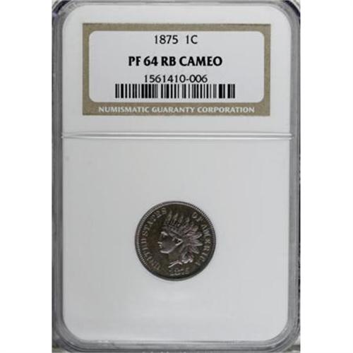 <B>1875 1C PR64 Red and Brown Cameo NGC.</B></I> A radiant near-Gem with salmon-pink and sky-blue toning. Exactingly struck and essentially carbon-free. The reverse rim has a small strike-through at 9 o'clock.<BR><BR><B>Coin Engraver:</B> James B. Longacre<BR><BR><b>Shipping:</b> Coins & Currency (<a target="_blank" href="http://www.heritageauctions.com/common/shipping.php">view shipping information</a>)