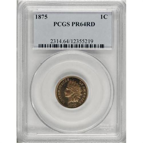 <B>1875 1C PR64 Red PCGS.</B></I> Snow-PR3. The peak of the 5 is lightly recut. This well struck and flashy Choice proof is void of contact, and small spots near the 1 in the date and the upper arrowhead are appropriate for the grade.<BR><BR><B>Coin Engraver:</B> James B. Longacre<BR><BR><b>Shipping:</b> Coins & Currency (<a target="_blank" href="http://www.heritageauctions.com/common/shipping.php">view shipping information</a>)