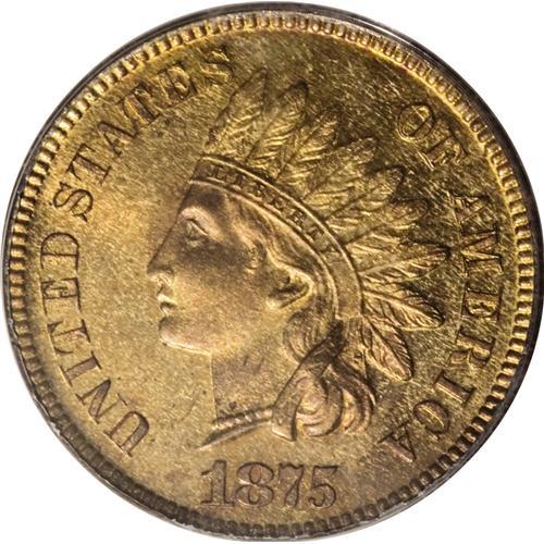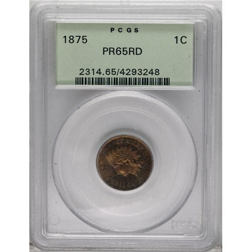 <B>1875 1C PR65 Red PCGS.</B></I> One of approximately 700 proof cents prepared in 1875, this lovely Gem is completely original. Rich cherry-red and orange-gold colors blend over powerfully impressed, carefully preserved surfaces. Select angles draw forth glassy reflectivity in the fields--a feature that contrasts nicely with the somewhat frosty textured devices. A few pinpoint carbon flecks are of little relevance. Encapsulated in a green label holder. Population: 12 in 65, 2 finer (3/07).<BR><BR><b>Shipping:</b> Coins & Currency (<a target="_blank" href="http://www.heritageauctions.com/common/shipping.php">view shipping information</a>)