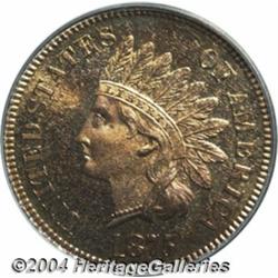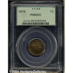 <B>1875<1C> PR65 Red PCGS.</B></I> One of approximately 700 proof Cents prepared in 1875, this lovely Gem is completely original. Rich cherry-red and orange-gold colors blend over powerfully impressed, carefully preserved surfaces that are devoid of even a single noteworthy distraction. Select angles draw forth glassy reflectivity in the fields--a feature that contrasts nicely with the somewhat frosty textured devices. The 1875 is one of the more elusive proof Indian cents from the 1870s, particularly as a fully lustrous Gem. Population: 11 in 65, 2 finer (3/04). <BR><BR><B>Important notice:</B> Heritage usually auctions material at the rate of 200-250 lots per hour. On some occasions eBay Live bid software or the Internet may not be able to keep up with the pace of the auction. We recommend placing a realistic absentee bid now as insurance to avoid disappointment. Occasionally the auctioneer may eliminate or reject an eBay Live bid, and the auctioneer may also reopen a lot after the close of the eBay live bidding (usually because we missed an audience bid), and may reject your bid even if it shows you as the winning bidder. By bidding via eBay Live, you agree that Heritage may award the lot to another bidder at its sole discretion under the circumstances described above or any other reasonable circumstances. Since eBay bids are not shown to us until we open the lot on the floor, we treat those bids just like floor bids. In most cases the floor responds before the eBay bid is presented to us, due to Internet lag time, so for consistency we have made it a policy that floor bids are always considered first over tie eBay live bids. Also please note that all Heritage lots purchased through eBay Live carry a 20% Buyer's Premium. Please make sure you read the Terms and Conditions before you bid. </span></font></tr></table></td></tr></table>