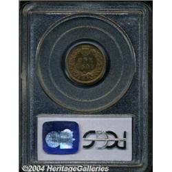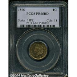 <B>1875<1C> PR65 Red PCGS.</B></I> While the 1875 is normally found with only moderate reflectivity, this is a strongly mirrored example that shows rich red color except over the lower portion of the reverse where some deeper, iridescent mellowing is seen. An exceptionally pleasing example of this scarce early proof issue. Population: 11 in 65 Red, 2 finer (3/04). <BR><BR><B>Important notice:</B> Heritage usually auctions material at the rate of 200-250 lots per hour. On some occasions eBay Live bid software or the Internet may not be able to keep up with the pace of the auction. We recommend placing a realistic absentee bid now as insurance to avoid disappointment. Occasionally the auctioneer may eliminate or reject an eBay Live bid, and the auctioneer may also reopen a lot after the close of the eBay live bidding (usually because we missed an audience bid), and may reject your bid even if it shows you as the winning bidder. By bidding via eBay Live, you agree that Heritage may award the lot to another bidder at its sole discretion under the circumstances described above or any other reasonable circumstances. Since eBay bids are not shown to us until we open the lot on the floor, we treat those bids just like floor bids. In most cases the floor responds before the eBay bid is presented to us, due to Internet lag time, so for consistency we have made it a policy that floor bids are always considered first over tie eBay live bids. Also please note that all Heritage lots purchased through eBay Live carry a 20% Buyer's Premium. Please make sure you read the Terms and Conditions before you bid. </span></font></tr></table></td></tr></table>