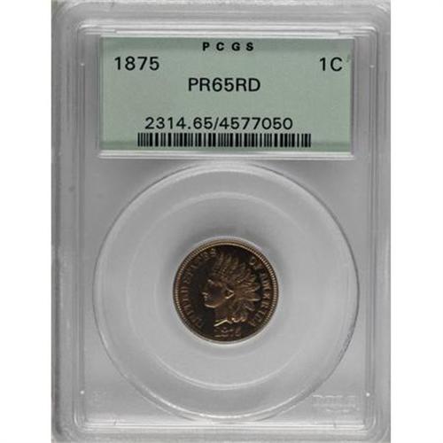 <B>1875 1C PR65 Red PCGS.</B></I> A small die line appears in the denticles below 18, a variety Rick Snow notes in his <I>Flying Eagle & Indian Cents </B></I>reference of 1992. The reverse has a bulging right pennant on the T in CENT. The small proof mintage of 700+ coins makes this issue a bit more difficult than most other dates in the 1870s. The surfaces are tan-red, with a few tiny darks flecks seen only under magnification, yet still broadly appealing and fully meriting the PR65 Red designation. Certified in a green-label holder. Population: 13 in 65 Red, 2 finer (6/07).<BR><I>Ex: Pennsylvania Cabinet Collection (Bowers and Merena, 3/97), lot 319, which realized $10,450.</B></I><BR><BR><B>Coin Engraver:</B> James B. Longacre<BR><BR><b>Shipping:</b> Coins & Currency (<a target="_blank" href="http://www.heritageauctions.com/common/shipping.php">view shipping information</a>\)