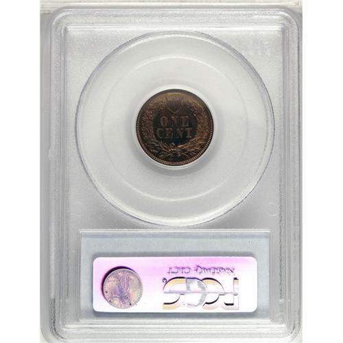 <B>1875<1C> PR65 Red and Brown PCGS.</B></I> This is a sharply struck Gem proof with deeply reflective fields. The obverse has considerable lilac and blue toning blended with orange luster. The reverse is brighter and nearly full Red.