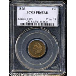 <B>1875<1C> PR65 Red and Brown PCGS.</B></I> Bright pumpkin-orange color dominates this sharply struck Gem. A couple of small specks on the obverse are noted for accuracy. <BR><BR><B>Important notice:</B> Heritage usually auctions material at the rate of 200-250 lots per hour. On some occasions eBay Live bid software or the Internet may not be able to keep up with the pace of the auction. We recommend placing a realistic absentee bid now as insurance to avoid disappointment. Occasionally the auctioneer may eliminate or reject an eBay Live bid, and the auctioneer may also reopen a lot after the close of the eBay live bidding (usually because we missed an audience bid), and may reject your bid even if it shows you as the winning bidder. By bidding via eBay Live, you agree that Heritage may award the lot to another bidder at its sole discretion under the circumstances described above or any other reasonable circumstances. Since eBay bids are not shown to us until we open the lot on the floor, we treat those bids just like floor bids. In most cases the floor responds before the eBay bid is presented to us, due to Internet lag time, so for consistency we have made it a policy that floor bids are always considered first over tie eBay live bids. Also please note that all Heritage lots purchased through eBay Live carry a 20% Buyer's Premium. Please make sure you read the Terms and Conditions before you bid.