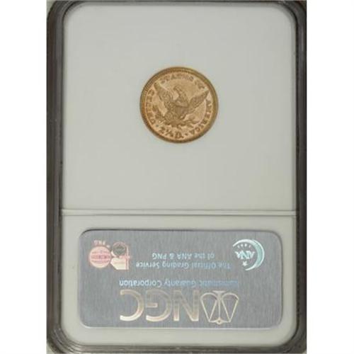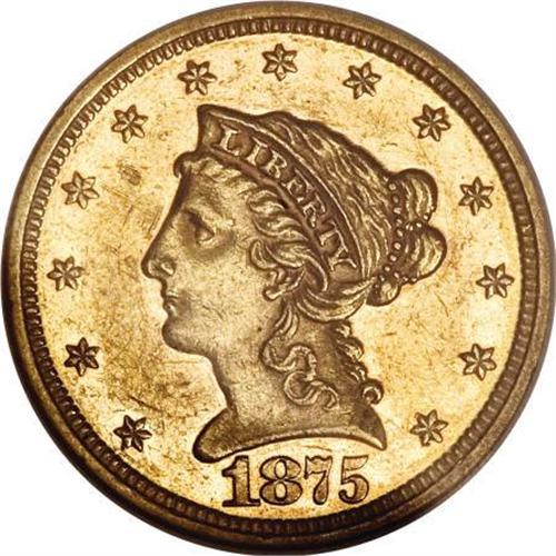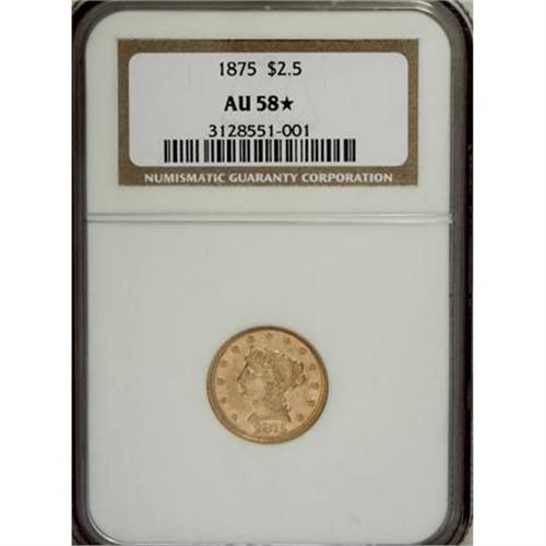 <B>1875 $2 1/2 AU58 <img src="/images/star.gif" width="10" height="10" alt="" border="0"> NGC.</B></I> This well struck example is moderately prooflike, and this is undoubtedly the reason it received a Star designation from NGC. Like most 1875 Philadelphia Mint gold denominations, the quarter eagle had an extremely low mintage. Only 400 business strikes and 20 proofs were struck. While the proofs were carefully preserved by the handful of advanced gold collectors of the day, business strikes were ignored by contemporary numismatists. Most survivors are XF to AU, and NGC has graded none above MS60. Census: 12 in 58, 2 finer (3/08).<BR><BR><B>Coin Engraver:</B> Christian Gobrecht<BR><BR><b>Shipping:</b> Coins & Currency (<a target="_blank" href="http://www.heritageauctions.com/common/shipping.php">view shipping information</a>)