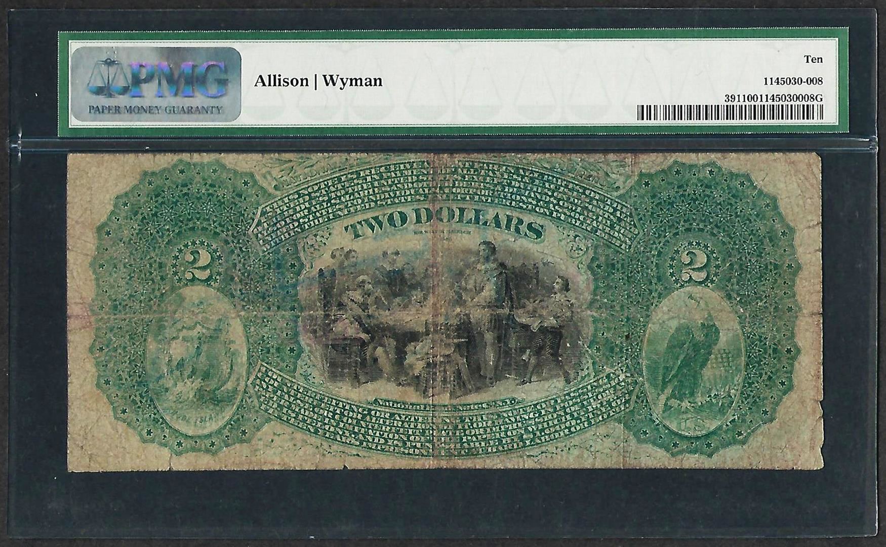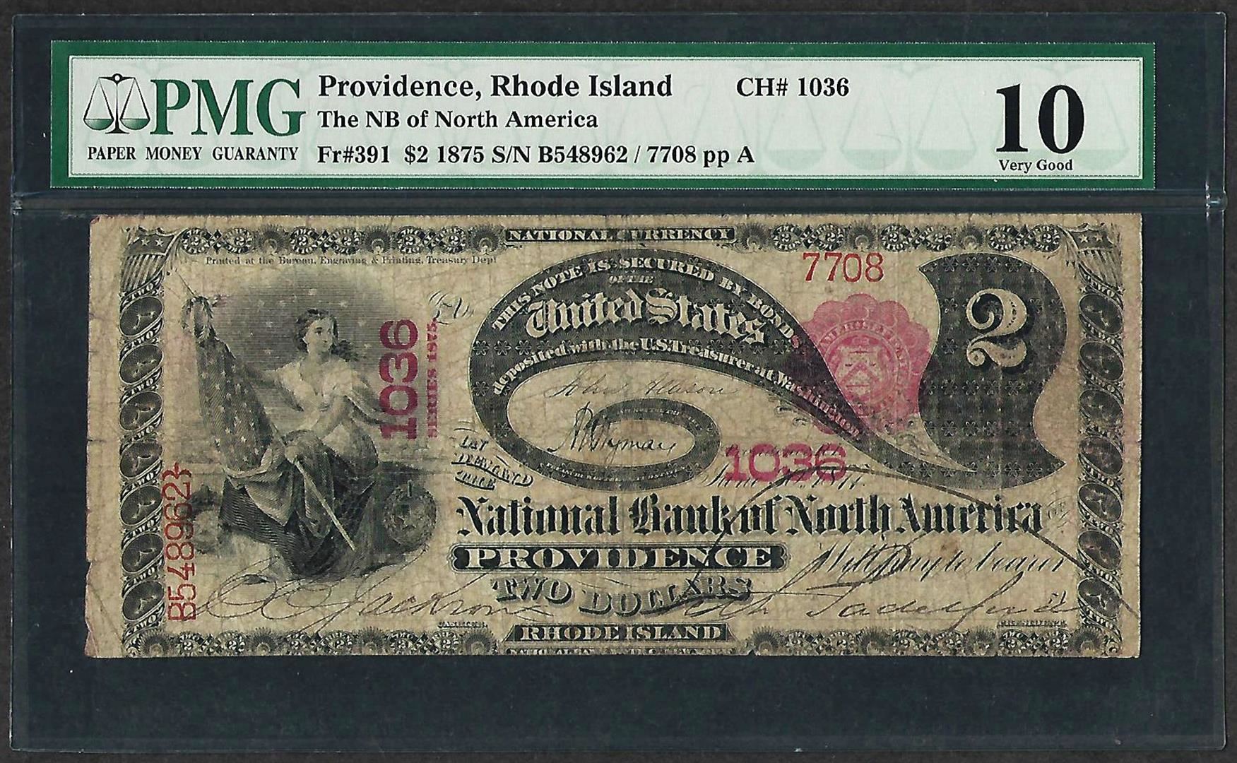 One 1875 $2 Lazy Deuce North America Providence, RI National Currency Note PMG Very Good 10. PMG Certified.