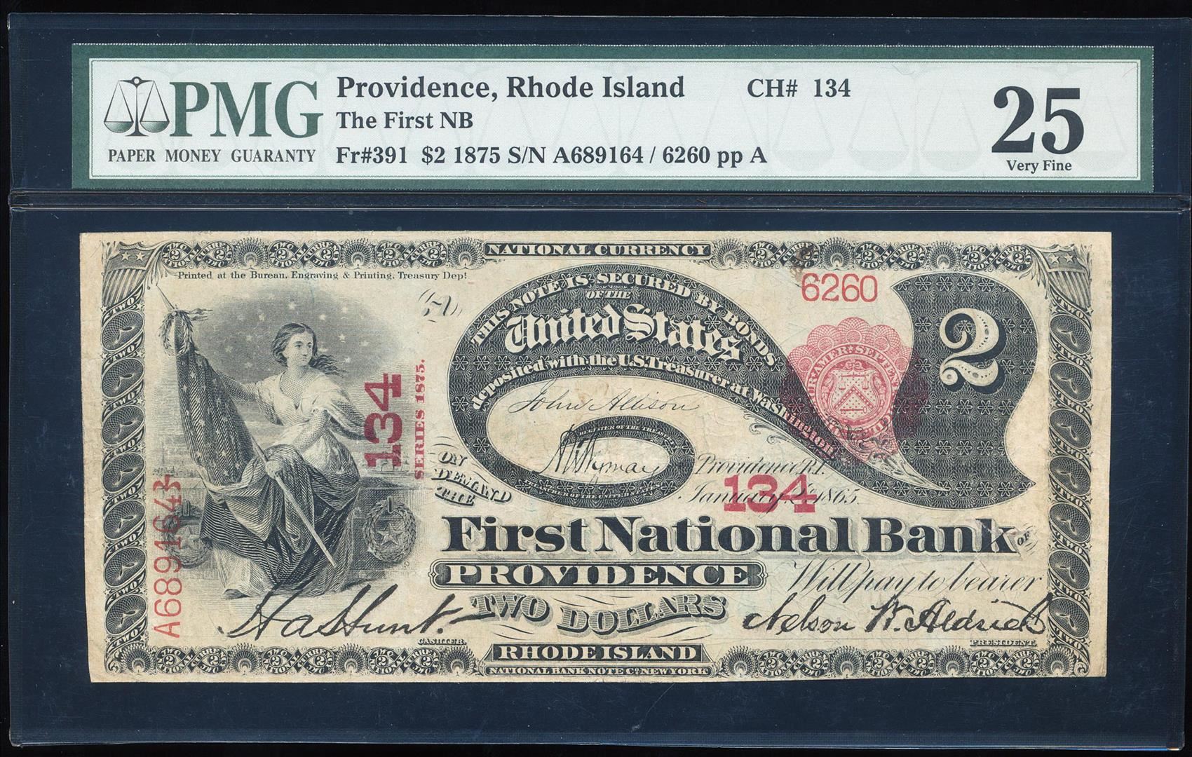 One 1875 $2 Lazy Deuce Providence, Rhode Island CH# 134 National Note PMG Very Fine 25. PMG Certified.