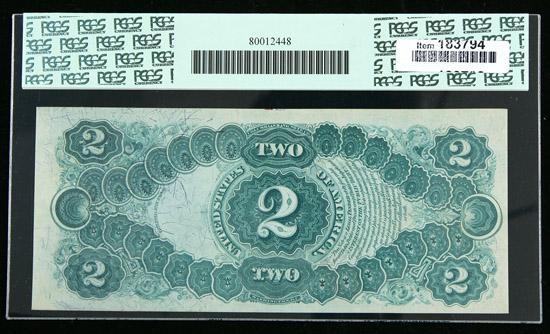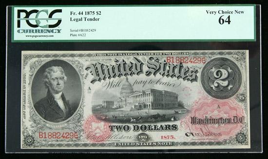 1875, $2 United States Note. PCGS Very Choice New 64. . Fr-44. This beautiful Deuce is blessed with great colors, terrific original paper quality, and margins that, although not even, are above average for the type. It lacks the "PPQ" designation only because of a single, well hidden pinhole near the bottom center of the design. This is a slightly scarcer Fr. number, particularly in high grades, as PCGS Currency has graded just two pieces in this grade with only three examples (all 65Ppqs) finer. Only about 80 examples are known in all grades combined.
