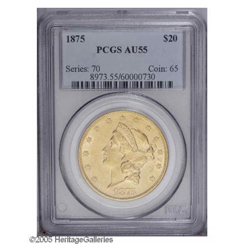 1875 $20 AU55 PCGS. A bright lemon-tinged Type Two Twe 1875[$20] AU55 PCGS.