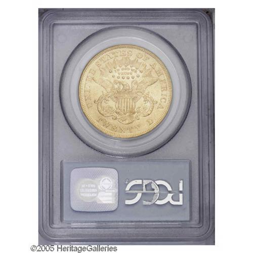 <B>1875<$20> AU55 PCGS.</B></I> A bright lemon-tinged Type Two Twenty with extensive luster and a crisp strike. Typically abraded for a briefly circulated large denomination gold coin.