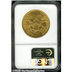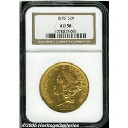 <B>1875 $20 AU58 NGC.</B></I> Well struck and fully lustrous, with bright pink and green-gold coloration, a trace of wear on the highpoints, and a somewhat scuffy overall appearance due to numerous moderate abrasions. Has a Mint State look, however, because of the sparkling, frosty luster on both sides.