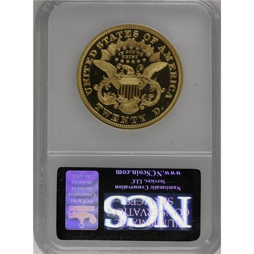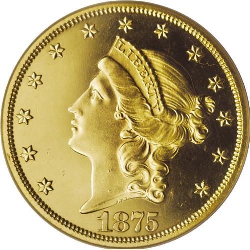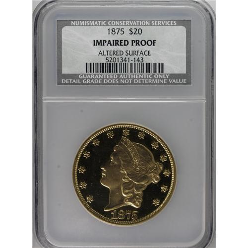 <B>1875 $20 --Altered Surface--NCS. Impaired Proof.</B></I> 1875 is one of the rarest dates for collectors of Philadelphia Mint gold coins. All proof denominations are very rare, of course, but the business issues are also extremely difficult, from the gold dollar to the eagle. Only the 1875 double eagle has a reasonable business strike production. However, just 20 proofs were struck, and Breen (1988) opines that "possibly 8-10 proofs survive." The last appearance of a proof 1875 double eagle in a Heritage auction was in our 2001 ANA Atlanta Signature, as part of the fabulous Genaitis collection of 1875 coinage. The present piece is precisely struck, and the frosted devices exhibit pleasing cameo contrast with the lightly hairlined fields. The opportunity to acquire a proof 1875 twenty seldom occurs, and years may pass before another affordable piece arrives on the market.<BR><BR><b>Shipping:</b> Coins & Currency (<a target="_blank" href="http://www.heritageauctions.com/common/shipping.php">view shipping information</a>)