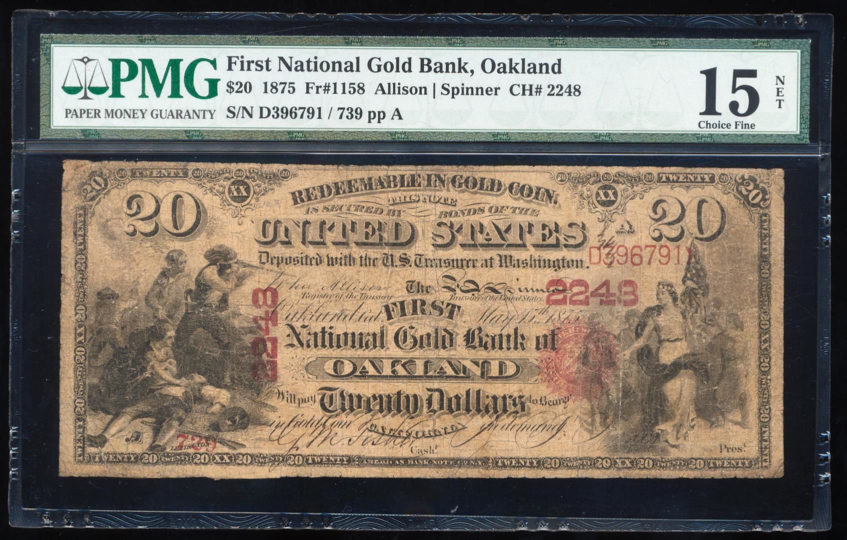 1875 $20 First National Gold Bank Oakland, CA CH# 2248 National Note PMG Ch. Fine 15 Net
