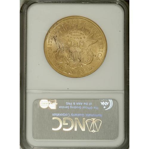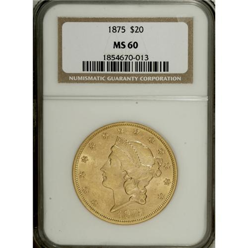 1875 $20 MS60 NGC. A fully lustrous piece that exhibit