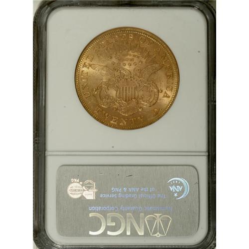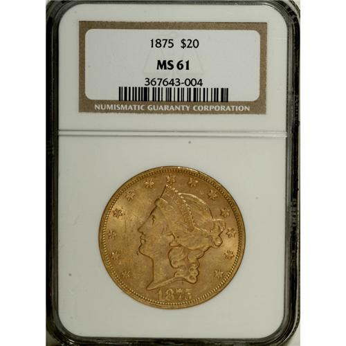 <B>1875 $20 MS61 NGC.</B></I> Rich apricot-gold color rests on softly lustrous surfaces. Generally well struck, except for softness in portions of Liberty's hair. Minute contact marks are scattered about, especially on the obverse. Most Uncirculated 1875 twenty dollar survivors are in the lower grade range of MS60 to MS62.<BR><BR><b>Shipping:</b> Coins & Currency (<a target="_blank" href="http://www.heritageauctions.com/common/shipping.php">view shipping information</a>)