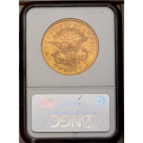 <B>1875<$20> MS61 NGC.</B></I> Well struck with coruscating luster and rich green-gold and rose toning. Faint hairlines and a few small blemishes limit the grade.
