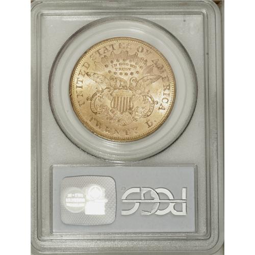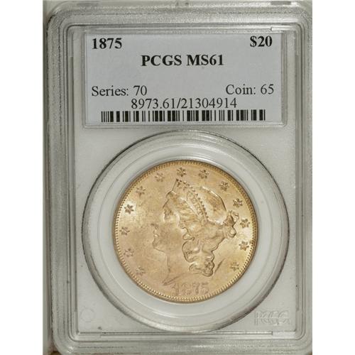 <B>1875<$20> MS61 PCGS.</B></I> A lustrous and well struck yellow-green piece with assorted marks. A severe abrasion appears in the right obverse field between the bust and the final star.