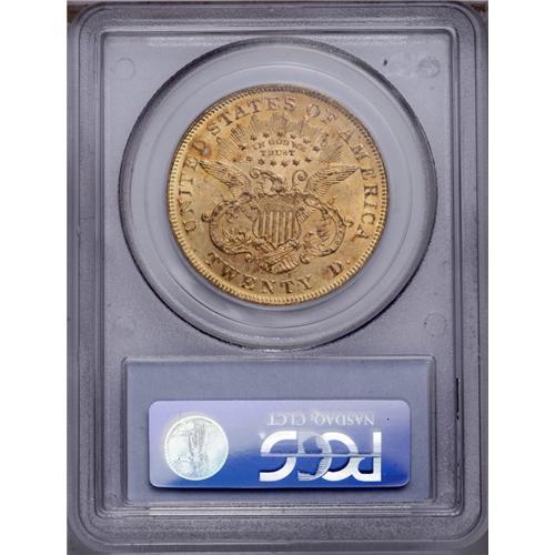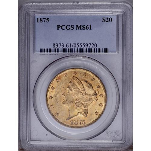 <B>1875<$20> MS61 PCGS.</B></I> Honey and reddish-gold patina, this effulgent double eagle is typically abraded for the grade with myriad marks on the obverse faces. The reverse is above average with relatively few marks that are worthy of mention.