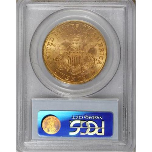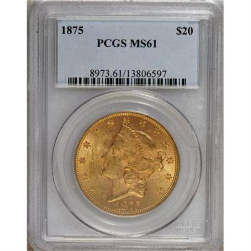 <B>1875 $20 MS61 PCGS.</B></I> While Philadelphia produced only nominal quantities of the other gold denominations in 1875, it struck nearly 300,000 double eagles. This luminous and unworn amber-gold example has strong peripheral detail, though the portrait is slightly weak. Numerous old, scattered marks account for the grade.<BR><BR><B>Coin Engraver:</B> James B. Longacre<BR><BR><b>Shipping:</b> Coins & Currency (<a target="_blank" href="http://www.heritageauctions.com/common/shipping.php">view shipping information</a>\)