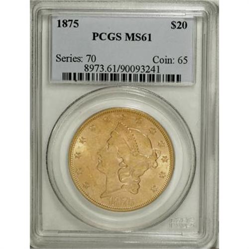 <B>1875 $20 MS61 PCGS.</B></I> Though the Philadelphia Mint struck few pieces in 1875, it did issue nearly 300,000 double eagles, a respectable sum for the time and the facility. Despite light to moderate abrasions on the satiny yellow-gold obverse and the shining reverse, the overall effect is pleasing.<BR><BR><B>Coin Engraver:</B> James B. Longacre<BR><BR><b>Shipping:</b> Coins & Currency (<a target="_blank" href="http://www.heritageauctions.com/common/shipping.php">view shipping information</a>)