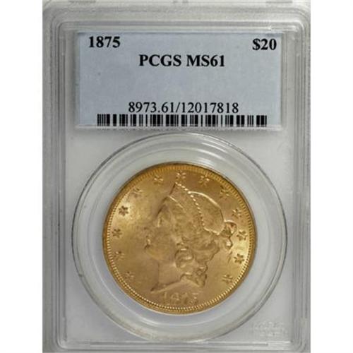 <B>1875 $20 MS61 PCGS.</B></I> Well-defined by the standards of the issue with vibrant luster that enlivens moderately abraded sun-gold surfaces. As one of the few denominations for the year with a significant mintage, the 1875 twenty attracts the interest of a broad range of collectors.<BR><I>From The York/Hallenbeck #2 Current Finest PCGS Registry Set of Liberty Double Eagles.</B></I><BR><BR><B>Coin Engraver:</B> James B. Longacre<BR><BR><b>Shipping:</b> Coins & Currency (<a target="_blank" href="http://www.heritageauctions.com/common/shipping.php">view shipping information</a>)