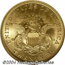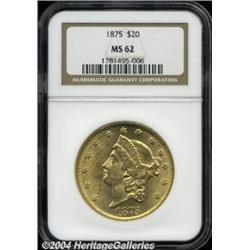 <B>1875<$20> MS62 NGC.</B></I> Even though the 1875 is one of the more common dates in the Type Two series, it is not an issue that we see all that often in Mint State grades. This is an attractive piece for the grade. The surfaces display soft, frosted mint luster and are minimally abraded with just a bit of reddish patina present. <BR><BR><B>Important notice:</B> Heritage usually auctions material at the rate of 200-250 lots per hour. On some occasions eBay Live bid software or the Internet may not be able to keep up with the pace of the auction. We recommend placing a realistic absentee bid now as insurance to avoid disappointment. Occasionally the auctioneer may eliminate or reject an eBay Live bid, and the auctioneer may also reopen a lot after the close of the eBay live bidding (usually because we missed an audience bid), and may reject your bid even if it shows you as the winning bidder. By bidding via eBay Live, you agree that Heritage may award the lot to another bidder at its sole discretion under the circumstances described above or any other reasonable circumstances. Since eBay bids are not shown to us until we open the lot on the floor, we treat those bids just like floor bids. In most cases the floor responds before the eBay bid is presented to us, due to Internet lag time, so for consistency we have made it a policy that floor bids are always considered first over tie eBay live bids. Also please note that all Heritage lots purchased through eBay Live carry a 20% Buyer's Premium. Please make sure you read the Terms and Conditions before you bid. </span></font></tr></table></td></tr></table>