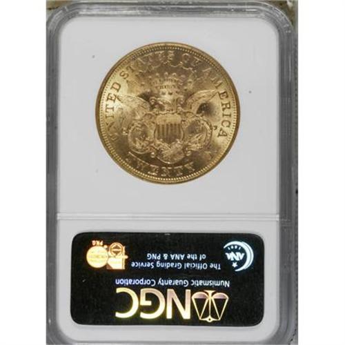 <B>1875 $20 MS62 NGC.</B></I> A yellow-orange example of this desirable Type Two Philadelphia double eagle issue, well struck overall with pleasing definition on the obverse stars. The portrait shows a number of light to moderate abrasions, including several on the brow.<BR><BR><B>Coin Engraver:</B> James B. Longacre<BR><BR><b>Shipping:</b> Coins & Currency (<a target="_blank" href="http://www.heritageauctions.com/common/shipping.php">view shipping information</a>)