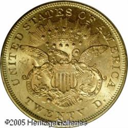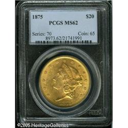 <B>1875 $20 MS62 PCGS.</B></I> The thick and buttery luster is interrupted by some marks, but the eye appeal is much better than usually seen in this grade. Golden-orange patina accents each side. Lot:9099