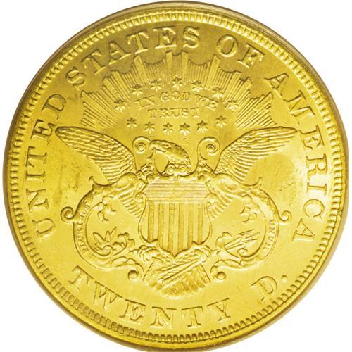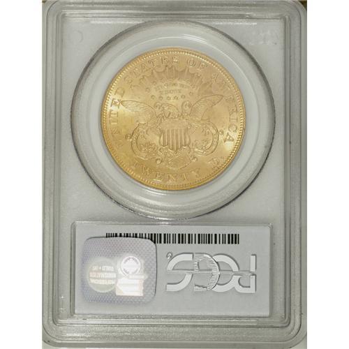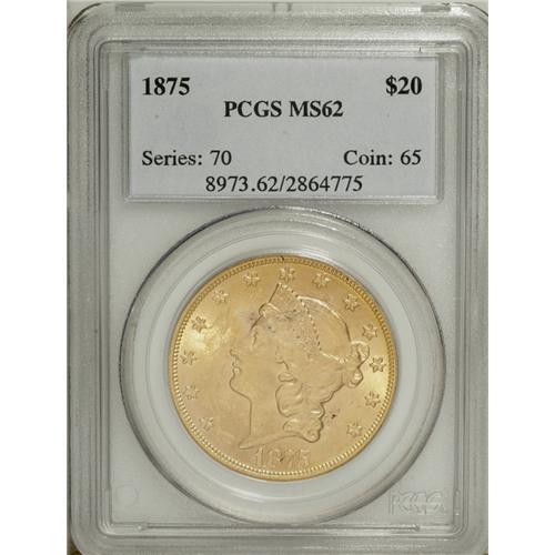 <B>1875 $20 MS62 PCGS.</B></I> This frosty Mint State piece has brilliant yellow-gold luster with scattered surface marks that are typical of examples at this grade level. Like so many double eagles from this era, this is a condition rarity with few finer grade coins certified. PCGS has only graded 47 finer coins (10/06) in two decades of certification.<BR><BR><b>Shipping:</b> Coin/Currency (<a target="_blank" href="http://www.heritageauctions.com/common/shipping.php">view shipping information</a>)