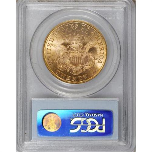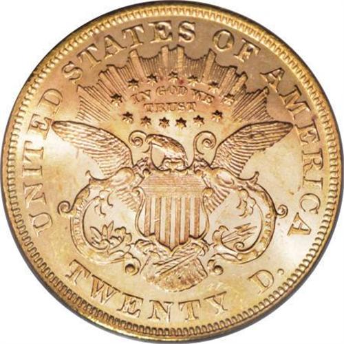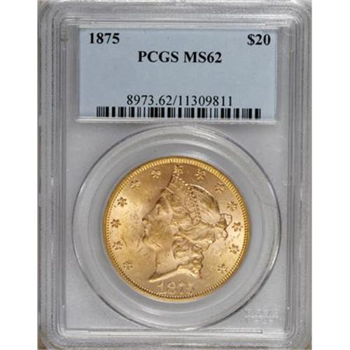 <B>1875 $20 MS62 PCGS.</B></I> The 1875 is one of the more available P-mint Type Two twenties. Several hundred Mint State coins may exist today, but only a couple of dozen are known finer than this MS62. The surfaces show bright, flashy mint luster, and there are the expected numerous, small abrasions on the obverse that account for the grade. Sharply defined throughout. <BR><BR><b>Shipping:</b> Coins & Currency (<a target="_blank" href="http://www.heritageauctions.com/common/shipping.php">view shipping information</a>)