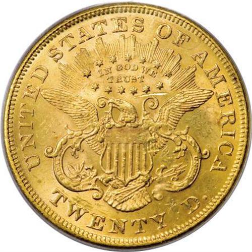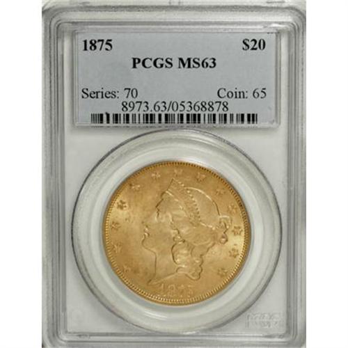 <B>1875 $20 MS63 PCGS.</B></I> By Type Two double eagle standards, the 1875 is not particularly difficult. Still, each such issue is a challenge in its own right, and the 1875 is hardly an exception in Mint State, particularly above MS60. Most of the survivors from the mintage, which consisted of just under 300,000 pieces, fall short of the MS63 level, where the issue becomes conditionally scarce. This Select representative offers silky butter-yellow surfaces and pleasing detail overall, though a trace of softness affects the portrait. Despite light, scattered abrasions, the obverse is pleasing for the grade, though a significant mark is present below the right side of IN GOD WE TRUST. A strongly lustrous example that displays well. PCGS has certified only three coins finer (7/07).<BR><BR><B>Coin Engraver:</B> James B. Longacre<BR><BR><b>Shipping:</b> Coins & Currency (<a target="_blank" href="http://www.heritageauctions.com/common/shipping.php">view shipping information</a>\)