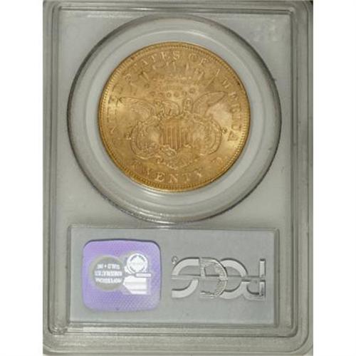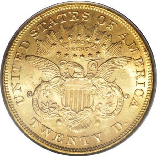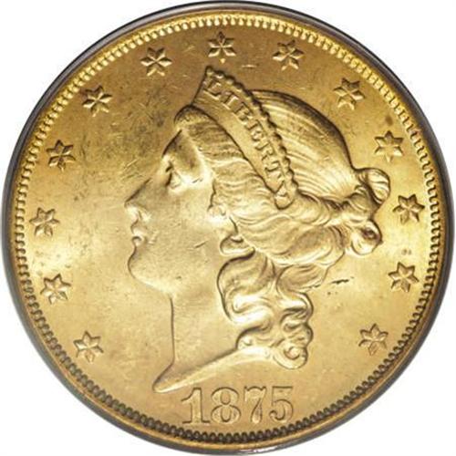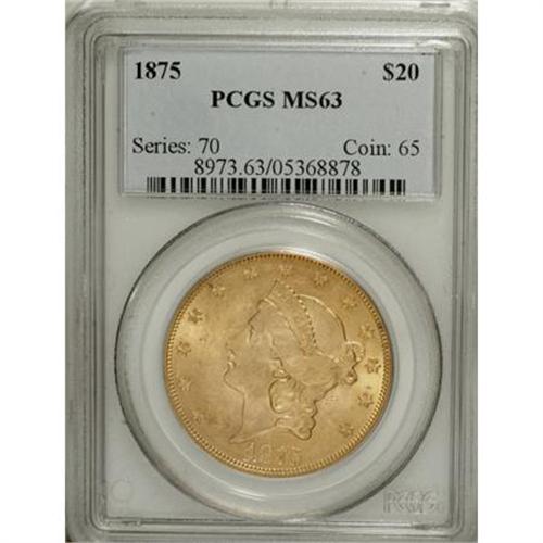 <B>1875 $20 MS63 PCGS.</B></I> By Type Two double eagle standards, the 1875 is not particularly difficult. Still, each such issue is a challenge in its own right, and the 1875 is hardly an exception in Mint State. Most of the survivors from the mintage of just under 300,000 pieces fall short of the MS63 level, where the issue becomes conditionally scarce. This Select representative offers silky butter-yellow and peach surfaces and pleasing detail overall, though a trace of softness affects the portrait. Despite light, scattered abrasions, the obverse is pleasing for the grade, though a significant mark is present below the right side of IN GOD WE TRUST. A strongly lustrous example that displays well. PCGS has certified only three coins finer (11/07). <BR><BR><B>Coin Engraver:</B> James B. Longacre<BR><BR><b>Shipping:</b> Coins & Currency (<a target="_blank" href="http://www.heritageauctions.com/common/shipping.php">view shipping information</a>)