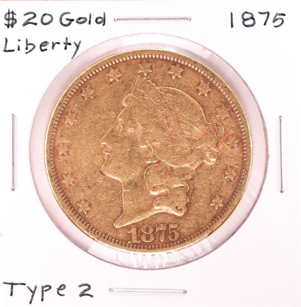 One 1875 $20 Type 2 Liberty Head Double Eagle Gold Coin.