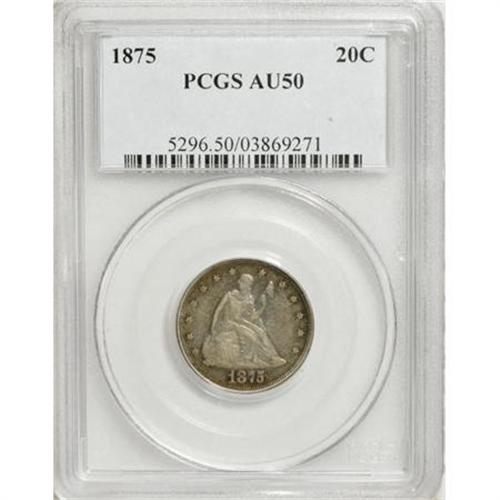 <B>1875 20C AU50 PCGS.</B></I> PCGS Population (27/305). NGC Census: (7/244). Mintage: 36,900. Numismedia Wsl. Price for NGC/PCGS coin in AU50: $417. (#5296)<BR><BR><B>Coin Engraver:</B> William Barber<BR><BR><b>Shipping:</b> Coins & Currency (<a target="_blank" href="http://www.heritageauctions.com/common/shipping.php">view shipping information</a>)