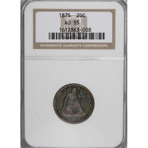 <B>1875 20C AU55 NGC.</B></I> NGC Census: (20/214). PCGS Population (55/233). Mintage: 36,900. Numismedia Wsl. Price for NGC/PCGS coin in AU55: $500. (#5296)<BR><BR><B>Coin Engraver:</B> William Barber<BR><BR><b>Shipping:</b> Coins & Currency (<a target="_blank" href="http://www.heritageauctions.com/common/shipping.php">view shipping information</a>)