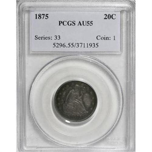 <B>1875 20C AU55 PCGS.</B></I> PCGS Population (56/237). NGC Census: (21/219). Mintage: 36,900. Numismedia Wsl. Price for NGC/PCGS coin in AU55: $525. (#5296)<BR><BR><B>Coin Engraver:</B> William Barber<BR><BR><b>Shipping:</b> Coins & Currency (<a target="_blank" href="http://www.heritageauctions.com/common/shipping.php">view shipping information</a>)