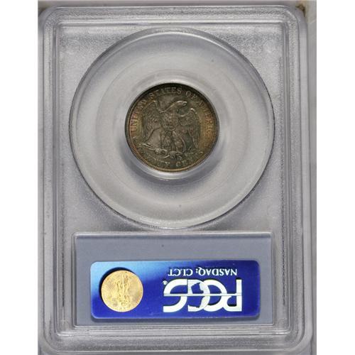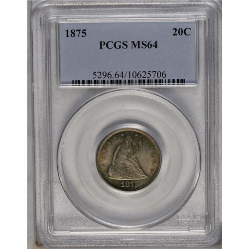 <B>1875<20C> MS64 PCGS.</B></I> A well struck example with satiny luster and even brownish-gray toning that yields to peach and rose iridescence near the borders. Surface marks are minimal and nearly nonexistent. The 1875 Philadelphia Mint twenty cent piece is considerably scarcer than either of the two Western mint issues of this date, although examples from Carson City are nearly as challenging in higher grades. Population: 62 in 64, 29 finer (5/06).