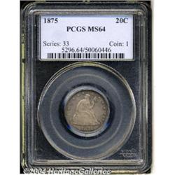 <B>1875<20C> MS64 PCGS.</B></I> Well struck with an attractive coating of original mauve-gray patina over both sides, along with sea-green rim toning, and carefully preserved surfaces that are nearly free of contact marks, save for a wispy blemish just below TA on the upper reverse. Perhaps just a bit too subdued to be graded as a Gem. Population: 53 in 64, 28 finer (3/04). <BR><BR><B>Important notice:</B> Heritage usually auctions material at the rate of 200-250 lots per hour. On some occasions eBay Live bid software or the Internet may not be able to keep up with the pace of the auction. We recommend placing a realistic absentee bid now as insurance to avoid disappointment. Occasionally the auctioneer may eliminate or reject an eBay Live bid, and the auctioneer may also reopen a lot after the close of the eBay live bidding (usually because we missed an audience bid), and may reject your bid even if it shows you as the winning bidder. By bidding via eBay Live, you agree that Heritage may award the lot to another bidder at its sole discretion under the circumstances described above or any other reasonable circumstances. Since eBay bids are not shown to us until we open the lot on the floor, we treat those bids just like floor bids. In most cases the floor responds before the eBay bid is presented to us, due to Internet lag time, so for consistency we have made it a policy that floor bids are always considered first over tie eBay live bids. Also please note that all Heritage lots purchased through eBay Live carry a 20% Buyer's Premium. Please make sure you read the Terms and Conditions before you bid. </span></font></tr></table></td></tr></table>