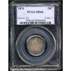 <B>1875<20C> MS64 PCGS.</B></I> Well struck with an attractive coating of original mauve-gray patina over both sides, along with sea-green rim toning, and carefully preserved surfaces that are nearly free of contact marks, save for a wispy blemish just below TA on the upper reverse. Perhaps just a bit too subdued to be graded as a Gem. Population: 58 in 64, 29 finer (9/04). <BR><BR><B>Important notice:</B> Heritage usually auctions material at the rate of 200-250 lots per hour. On some occasions eBay Live bid software or the Internet may not be able to keep up with the pace of the auction. We recommend placing a realistic absentee bid now as insurance to avoid disappointment. Occasionally the auctioneer may eliminate or reject an eBay Live bid, and the auctioneer may also reopen a lot after the close of the eBay live bidding (usually because we missed an audience bid), and may reject your bid even if it shows you as the winning bidder. By bidding via eBay Live, you agree that Heritage may award the lot to another bidder at its sole discretion under the circumstances described above or any other reasonable circumstances. Since eBay bids are not shown to us until we open the lot on the floor, we treat those bids just like floor bids. In most cases the floor responds before the eBay bid is presented to us, due to Internet lag time, so for consistency we have made it a policy that floor bids are always considered first over tie eBay live bids. Also please note that all Heritage lots purchased through eBay Live carry a 20% Buyer's Premium. Please make sure you read the Terms and Conditions before you bid.