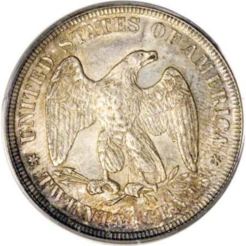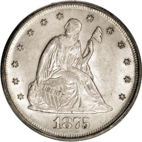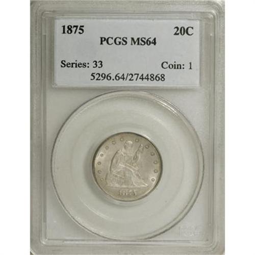 <B>1875 20C MS64 PCGS.</B></I> This attractive near-Gem twenty cent piece is essentially untoned on the obverse, but takes on wisps of russet, lavender, and cobalt-blue at the reverse borders. A well directed strike brings out sharp definition on the design features. A few minute handling marks on highly lustrous surfaces account for the grade.<BR><I>From The Mario Eller Collection, Part One.</B></I><BR><BR><B>Coin Engraver:</B> William Barber<BR><BR><b>Shipping:</b> Coins & Currency (<a target="_blank" href="http://www.heritageauctions.com/common/shipping.php">view shipping information</a>)