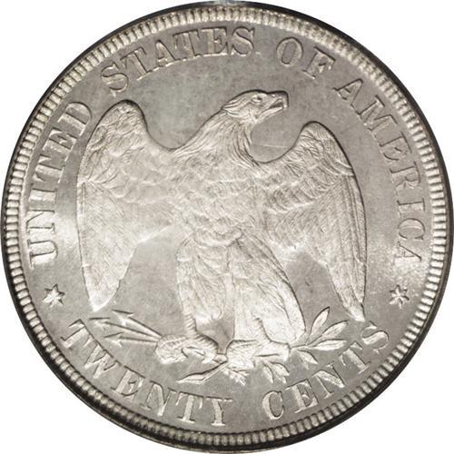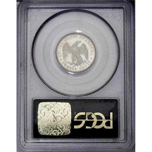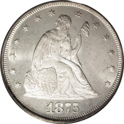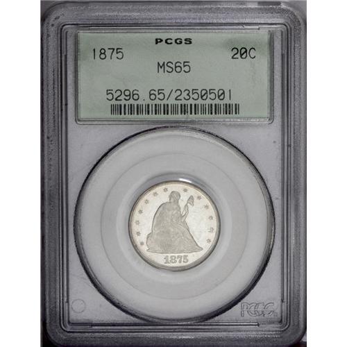 <B>1875<20C> MS65 PCGS.</B></I> Fully struck right up to the top of the eagle's left (facing) wing, and quite a find as such. The fields have a noticeable semi-reflective glimmer and the coin's natural brilliance is enhanced by a fully brilliant finish. Scarce in Gem condition, especially with reflective fields. Housed in an early PCGS holder with a green insert.