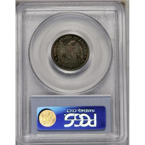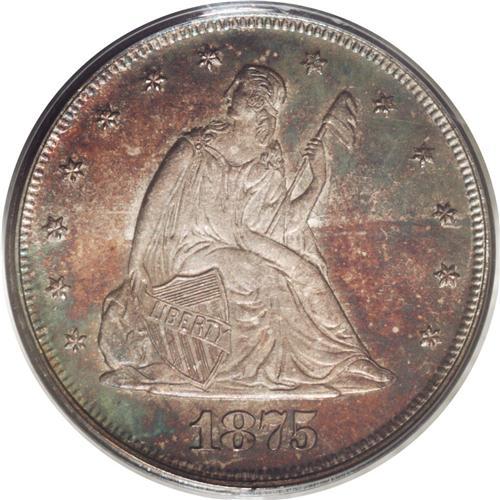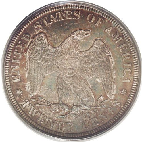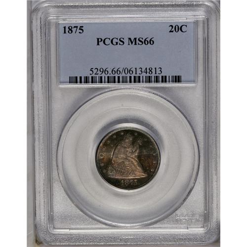 <B>1875<20C> MS66 PCGS.</B></I> Each side is deeply toned in mottled, but different color schemes. The obverse exhibits an overlay of deep crimson-gold, magenta, and turquoise-blue colors, the reverse is sea-green with antique-golden accents in the protected areas. Well defined overall with no mentionable marks or spots. An amazingly preserved twenty cent piece, destined for the collector of color. Population: 6 in 66, 3 finer (5/06).